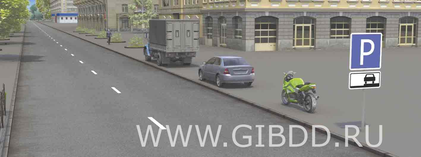 Парковкой, обозначенной знаком 6.4 «Парковка (парковочное место)» в сочетании с табличкой 8.6.3 «Способ постановки транспортного средства на стоянку», могут воспользоваться только водители легковых автомобилей и мотоциклов, расположив свои ТС на тротуаре вдоль его края. Грузовым автомобилям стоянка в этом месте запрещена.