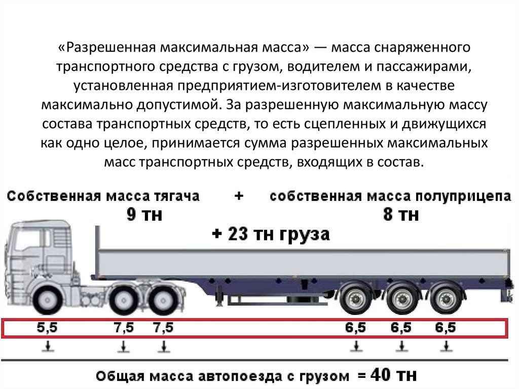 Допустимая масса двухосного транспортного средства (далее ТС) не может превышать 18 тонн, 25 тонн для 3-осного автомобиля и 32 тонны для 4-осного автомобиля. Масса 3-осного автопоезда не должна превышать 28 тонн, 4-осного автопоезда 36 тонн и 5-осного автопоезда 40 тонн.Предельная осевая нагрузка при расстоянии более 2-х метров между ближайшими осями не должна превышать 10 тонн на ось, при расстоянии от 1,65 до 2 метров включительно 9 тонн, при расстоянии от 1,35 до 1,65 м.