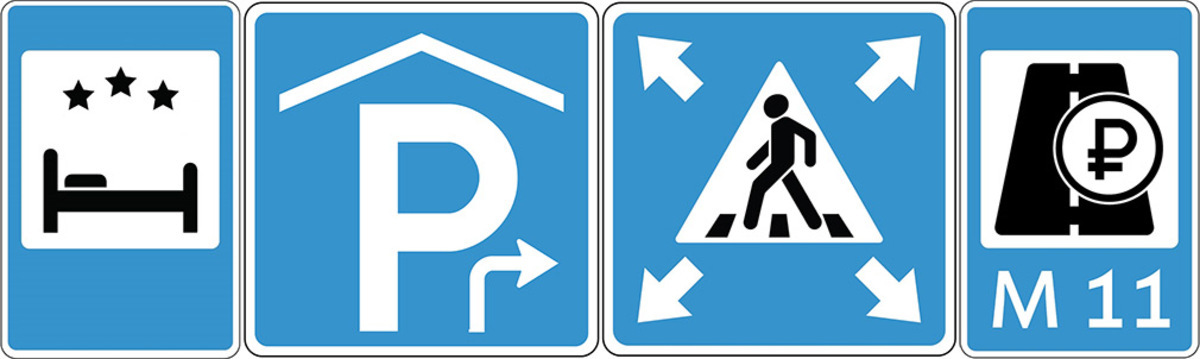 1.1, 8.1.3, 8.1.4, 8.5.1 — 8.5.7, 8.26, а также другую информацию (адрес, номер телефона и т.п.). При необходимости изображения символов с белым фоном знаков сервиса допускается размещать на одном щите с фоном синего цвета по ГОСТ 32945.