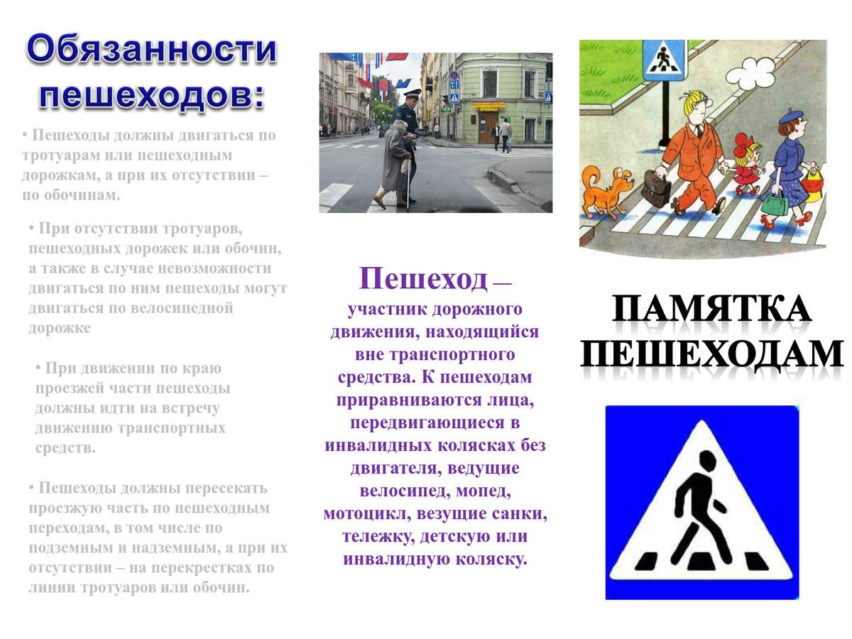 Правила дорожного движения обычно применяются к пешеходам.Например, если человек находится на перекрестке, контролируемом красным светом, также часто есть общие сигналы, когда пешеход может идти или должен ждать. Красный крестик означает не пересекаться. Как правило, пешеходы должны следовать этим знакам так же, как водители должны следовать на красный и зеленый свет. Существуют также правила о том, по какой стороне дороги следует ходить и носить светоотражающую одежду, если это возможно. Существуют и другие правила дорожного движения, которые применяются, если человек является пешеходом, а не водителем.