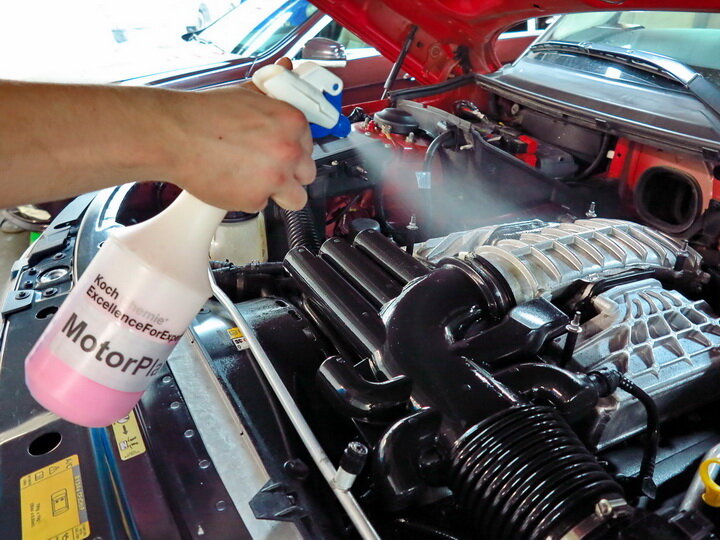 После прогрева двигателя и защиты чувствительных участков вы готовы нанести обезжириватель двигателя. Хотя они быстрые и легкие, я предостерегаю людей от использования агрессивных очистителей на нефтяной основе в моторном отсеке и не зря!