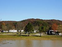 - лагерь для автотуристов с оборудованной парковкой, туалетами, местами для палаток или домиками лёгкого типа ◆ Прокладка маршрутов, строительство кемпингов, дорог и мотелей, все экономические расчёты строятся на том, что 90 процентов путешествий в Америке совершается в автомобиле. Василий Песков, Борис Стрельников, «Земля за океаном», 1977 г. (цитата из Национального корпуса русского языка, см. Список литературы)