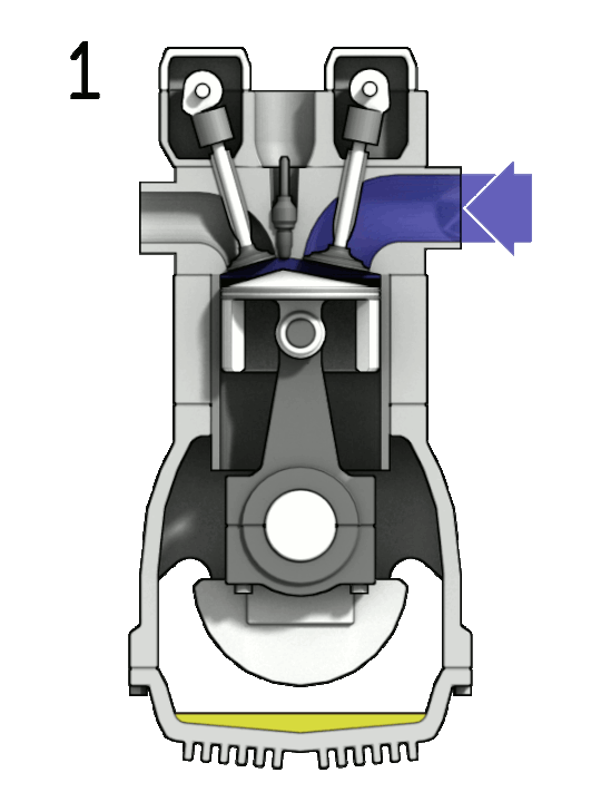 Двигатель цикл начинается с впускной ход как поршень тянул в сторону коленчатого вала (на рисунке слева).