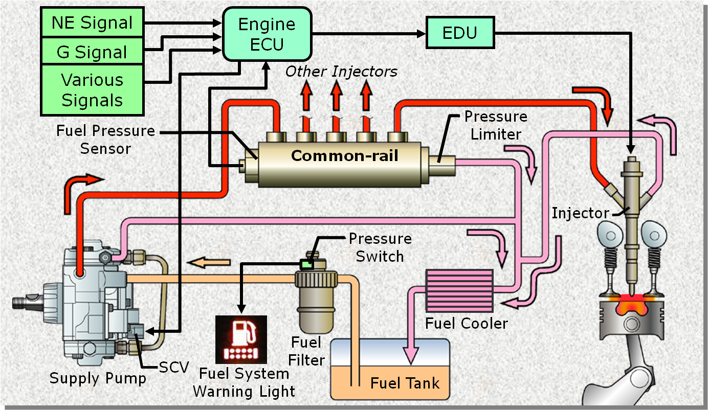 Затем он проходит через инжекторные линии и соединительные трубки, чтобы попасть к инжекторам. Регулятор давления топлива или исполнительный механизм управления топливом в насосе высокого давления контролирует давление в рампе.