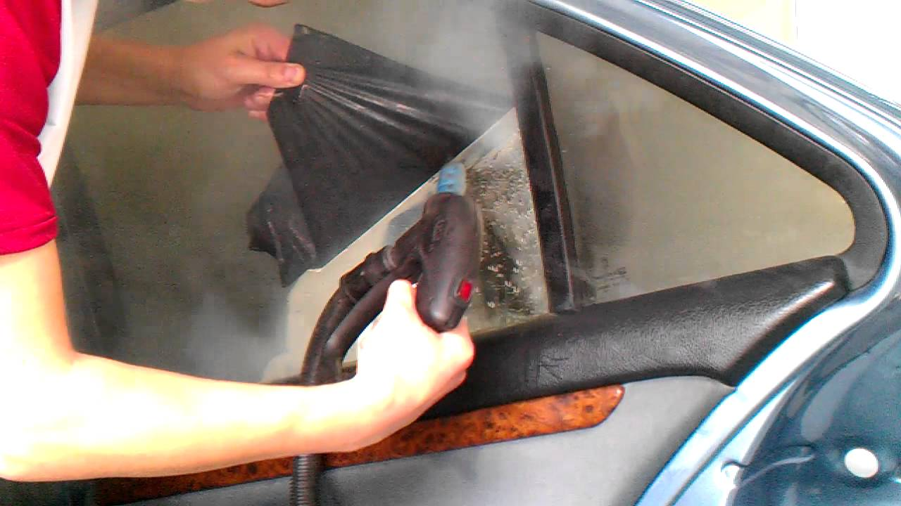 Снять солнцезащитную пленку с окна можно с помощью парогенератора. Для этого струю горячего пара сначала направляют на верхнюю часть стекла. Обработка должна выполняться не менее 7-10 минут, до тех пор, пока пленка не начнет без труда отставать от стекла. После этого можно переходить на другой участок. Так постепенно нужно очистить все окно от тонировочной пленки.