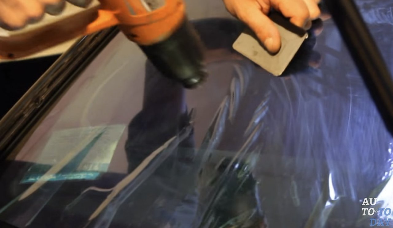 - Поверхность стекла, покрытую тонировкой, разогревают до температуры около 40 °С. Нельзя направлять струю горячего воздуха в одну точку, иначе окно лопнет. Стекло прогревают равномерно по всей поверхности.