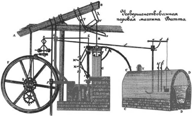 Примерно в это же время в Англии над созданием паровой машины работал шотландец Джеймс Уатт. Он занимался усовершенствованием двигателя Ньюкомена. Было ясно, что основной недостаток машины Ньюкомена состоял в попеременном нагревании и охлаждении цилиндра. Уатт предположил, что цилиндр может постоянно оставаться горячим, если до конденсации отводить пар в отдельный резервуар через трубопровод с клапаном. Более того, цилиндр может оставаться горячим, а конденсатор холодным, если снаружи их покрыть теплоизоляционным материалом. В 1768 г. он получил на свое изобретение патент, но построить машину смог только в 1776 г. Она оказалась вдвое эффективнее машины Ньюкомена.