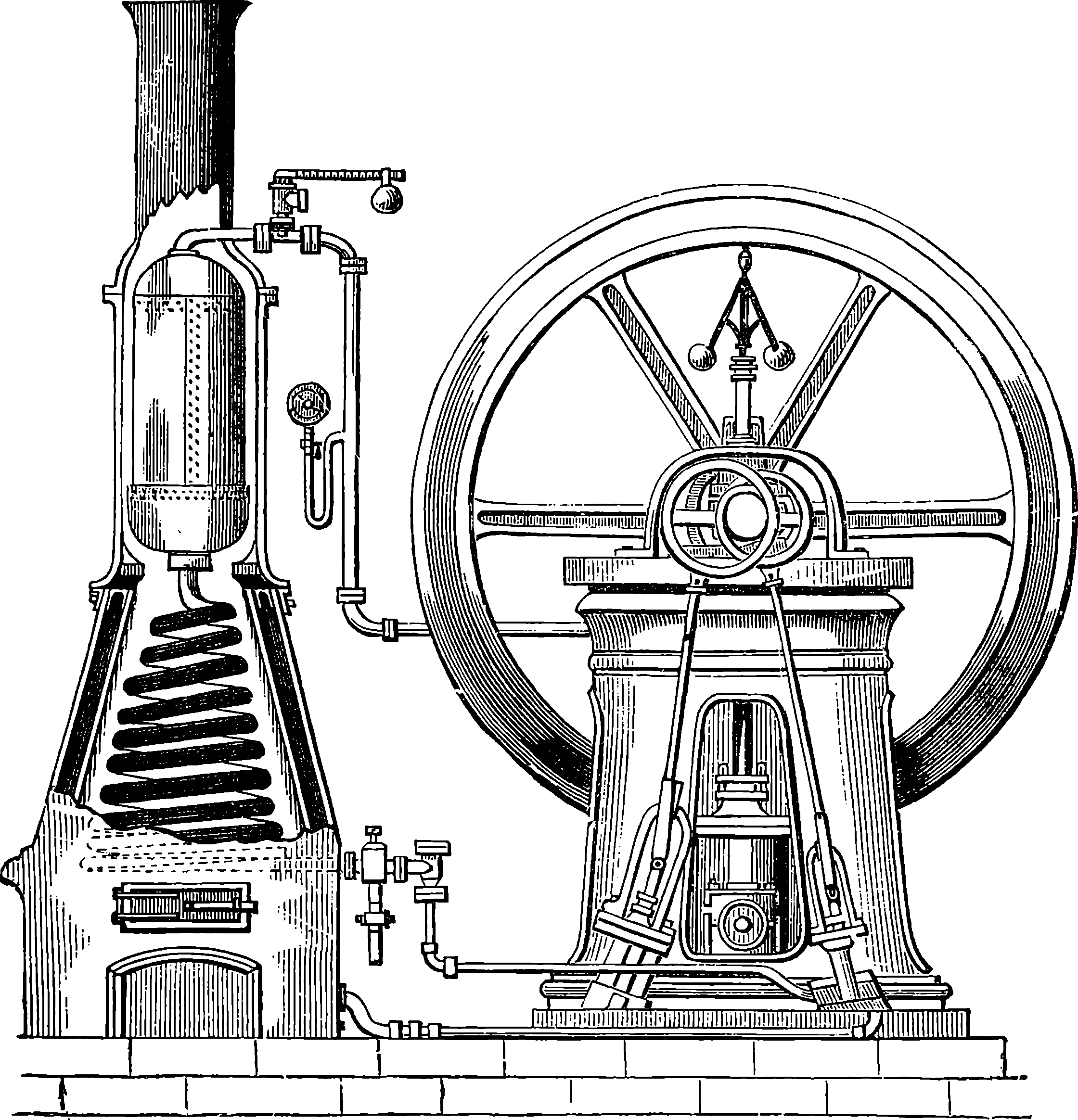 Первая паровая машина с поршнем была построена французом Дени Папеном в 1698 г. Вода нагревалась внутри вертикального цилиндра с поршнем, и образовавшийся пар толкал поршень вверх. Когда пар охлаждался и конденсировался, поршень опускался вниз под действием атмосферного давления. Посредством системы блоков паровая машина Папена могла приводить в действие различные механизмы, например насосы.