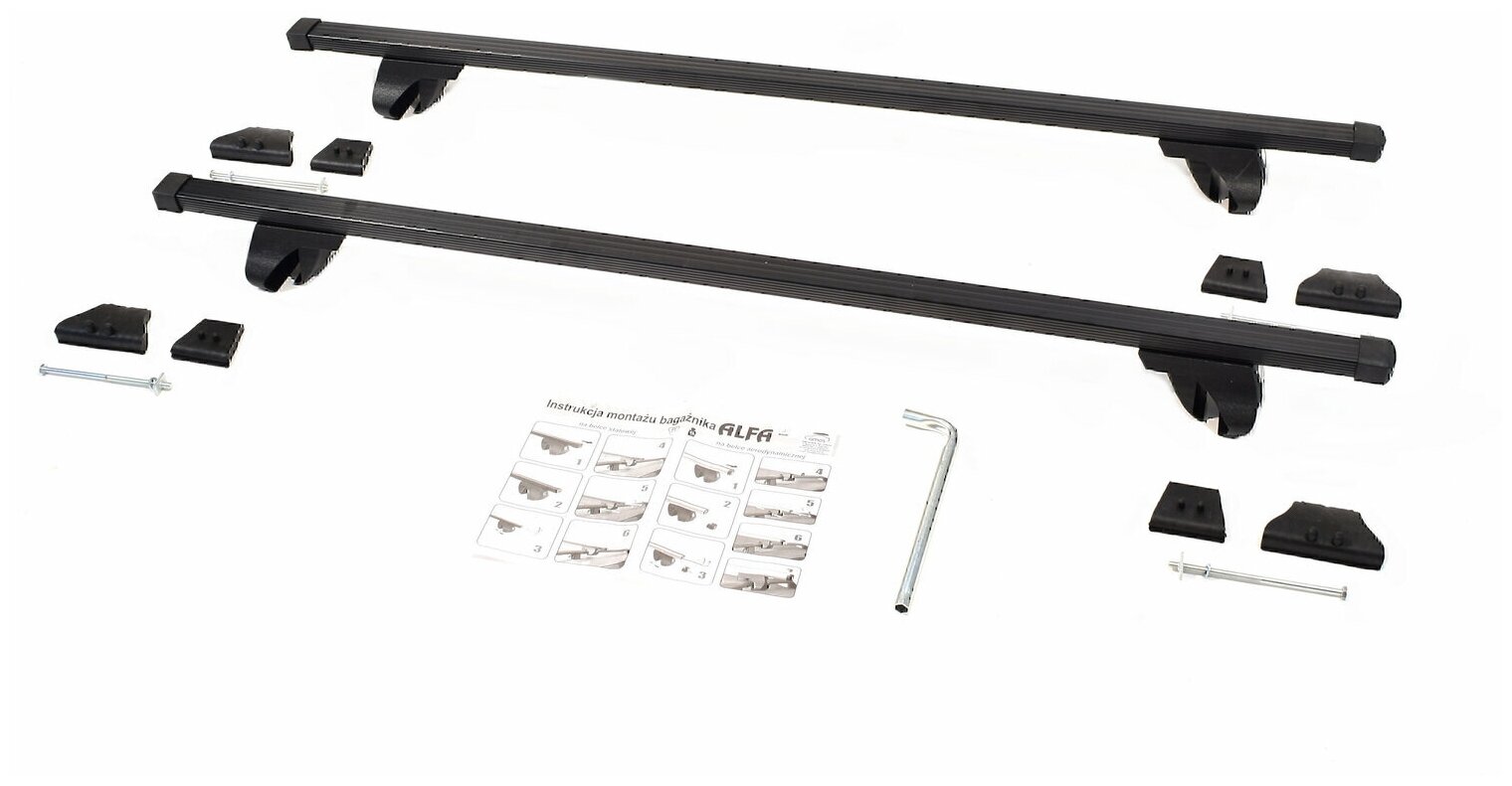 Состоит из поперечин прямоугольного профиля 22*32 мм и механизма крепления. Поперечины выполнены из стали и покрыты пластиком, обеспечивающим сохранность перевозимых грузов. Как вариант, к поставке предлагаются также багажники для автомобилей с алюминиевыми поперечинами.