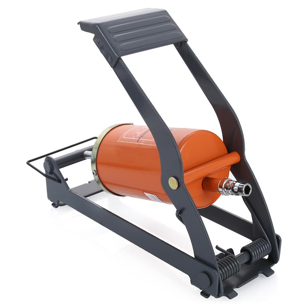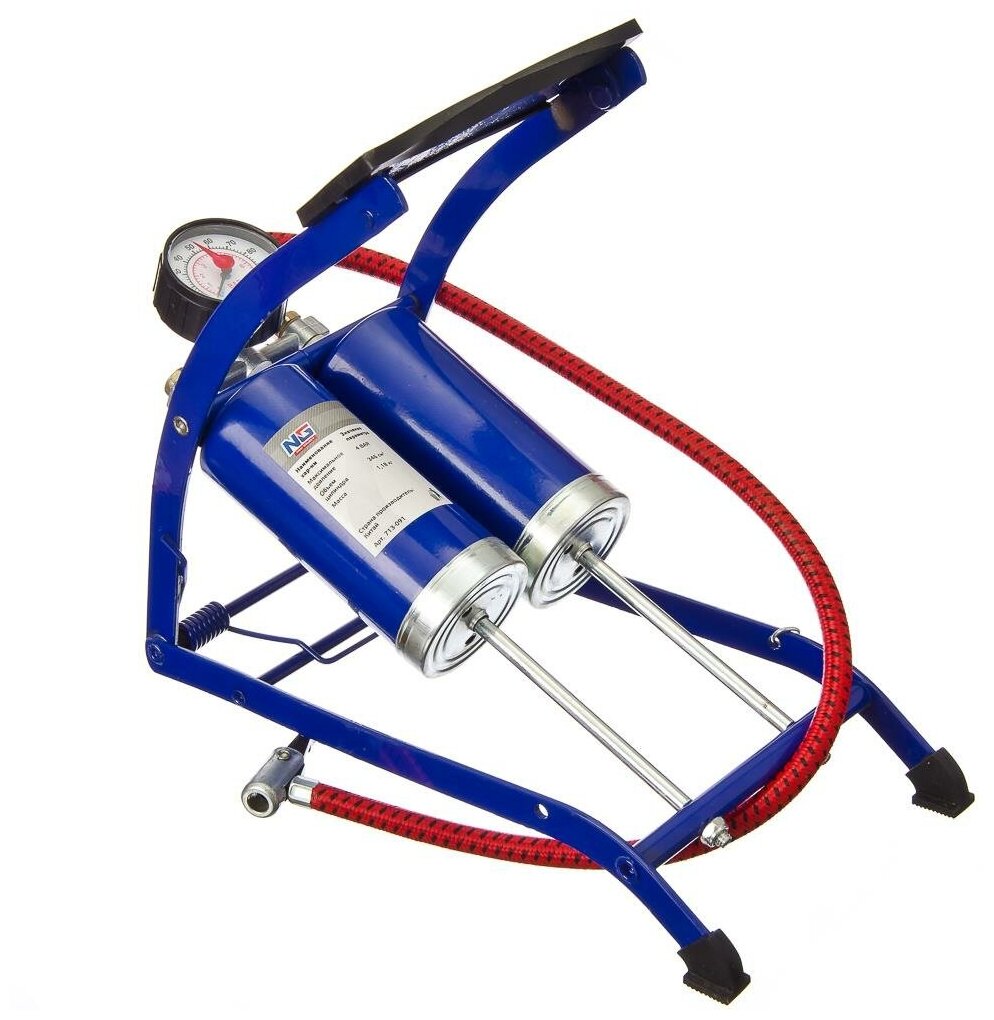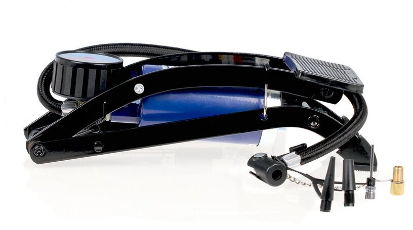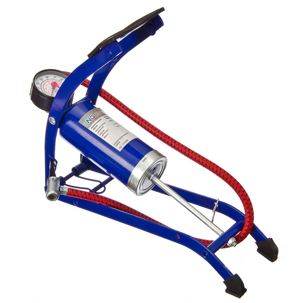 Ножной вариант имеет простую конструкцию и представлен в виде ножниц, с установленными посредине поршнем и цилиндром (баллоном). Из баллона выводится резиновая трубка, по которой, при нажатии ногой на педаль, воздух перемещается в колесо. Немаловажную роль в работе ножного насоса играет и закрепленный на нем манометр, который позволяет контролировать давление внутри шин. Общее устройство ножного насоса с манометром и принцип его действия практически не отличаются от стандартных вариантов.