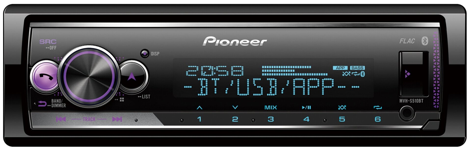 - Pioneer MVH-S320BT — имеет модуль Bluetooth с внешним микрофоном для пользования функцией hands-free. Можно подключать одновременно два телефона для передачи потокового ауди (A2DP). В конструкции есть тюнер с цифровой обработкой сигнала. Поддержка RDS позволяет выводить на экран передаваемую информацию. Подходит для воспроизведения форматов MP3, WMA, WAV, FLAC.
