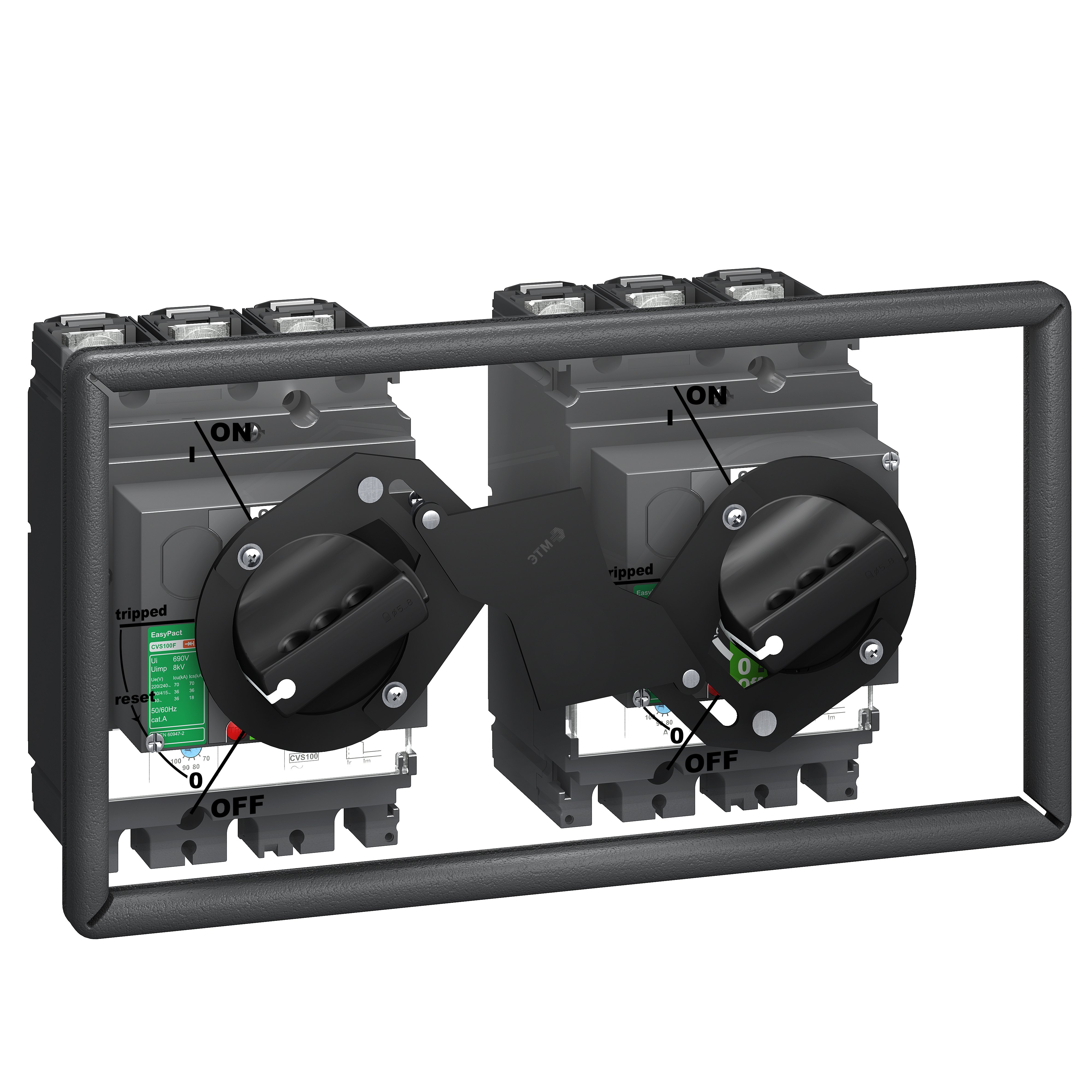 Доступны семейства механических блокировок для блокировки включения двух или трех автоматических выключателей. Механическая блокировка удерживает один или несколько автоматических выключателей в отключенном состоянии (предотвращает включение), когда другие замкнуты.