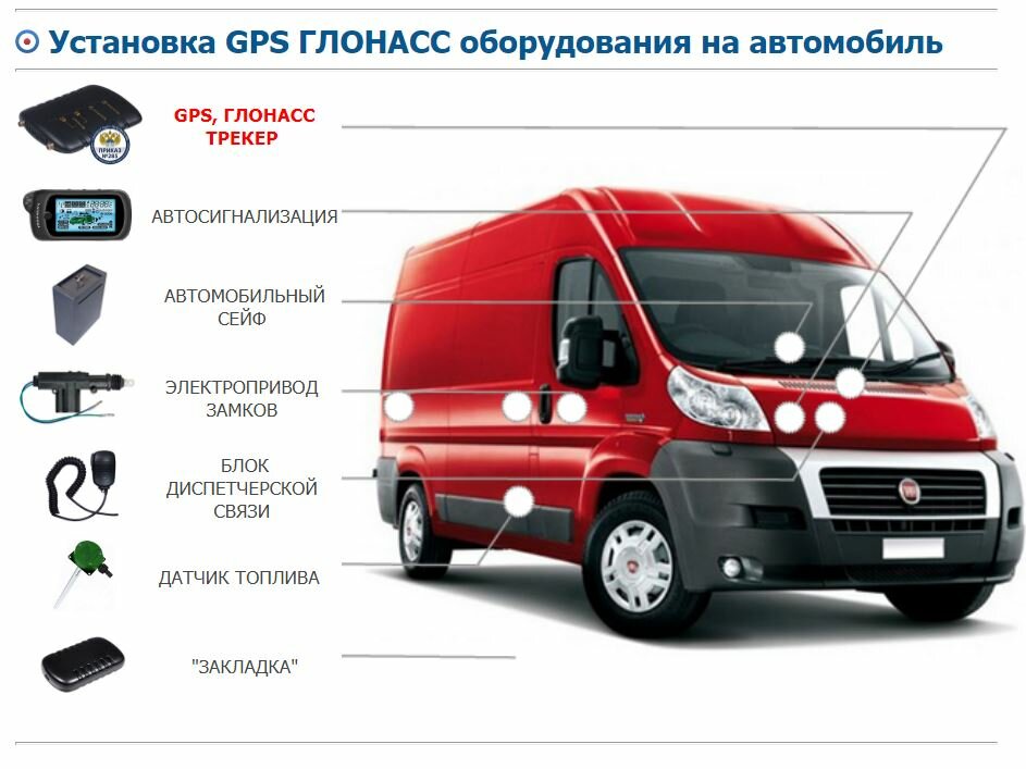 В комплект устройства, в зависимости от выбранного тарифа, входят ГЛОНАСС-трекер, приемник, система контроля топлива, антенны.