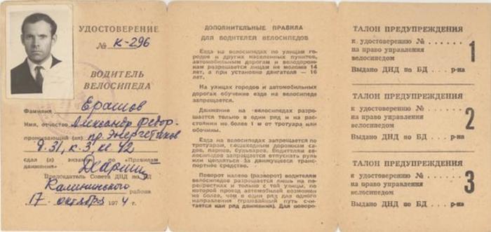 В советское время права на велосипед и их обязательная регистрация существовали в 30-х годах ХХ века. В них были данные владельца, фотография, прописка, а также краткая выписка из ПДД. За нарушение велосипедист мог получить предупреждение, заплатить штраф, а также лишиться прав или велосипедных номеров.