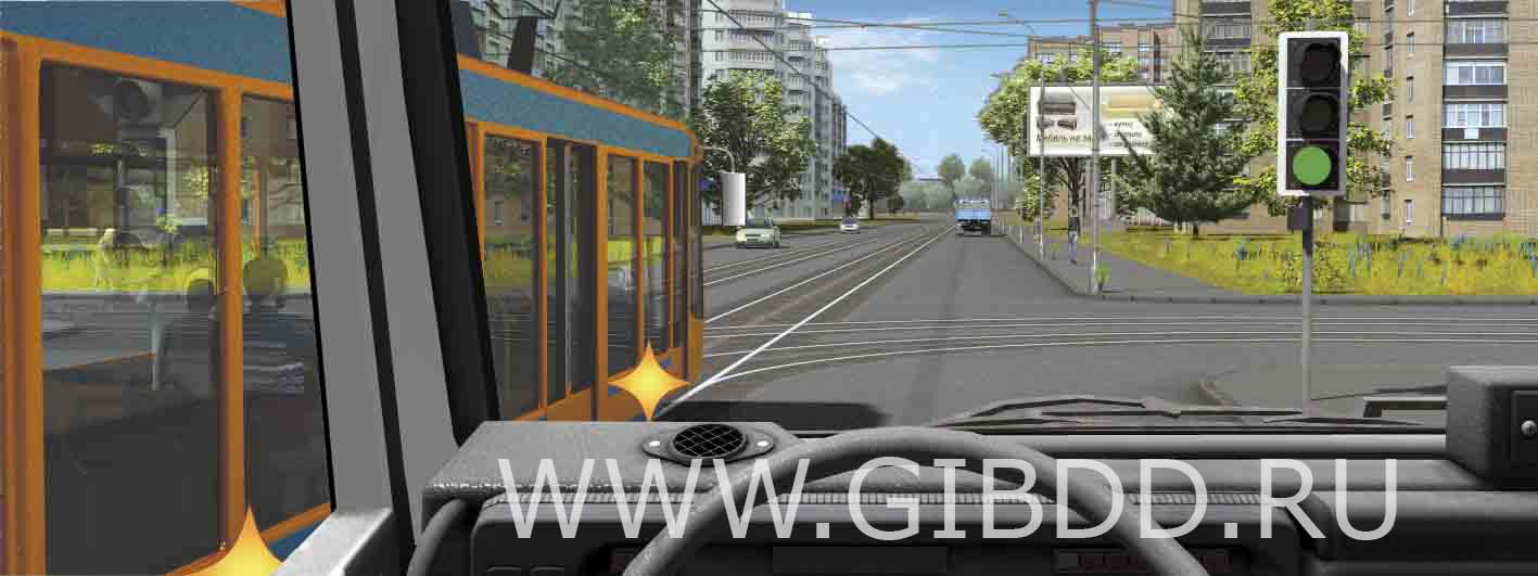 Вы намерены проехать перекресток в прямом направлении. Ваши действия?