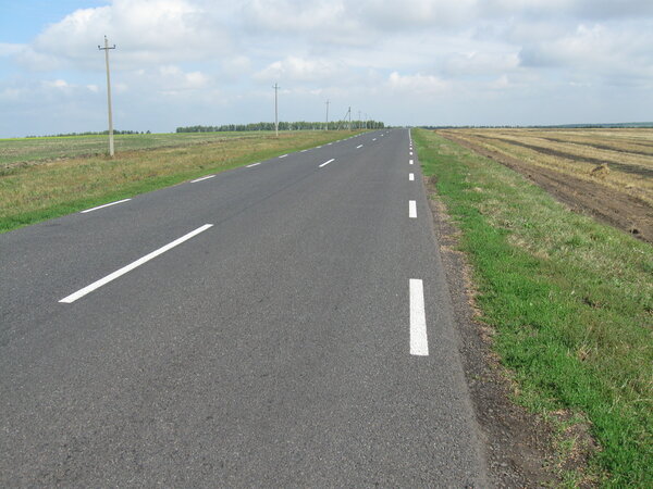 Трасса со свежим асфальтом и желтой разделительной полосой.