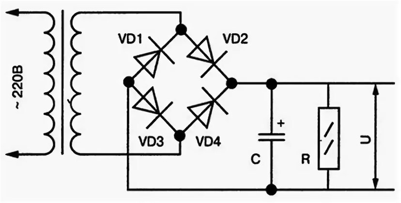 Схема диодного мостаОстальные два полюса – левый и правый – используются как входные контакты, на них подается переменное напряжение с вторичной обмотки понижающего трансформатора. А на выходы моста диоды подадут пульсирующее знакопостоянное напряжение.