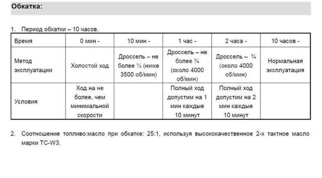 Многие бренды сегодня отказались от такого понятия, как «обкатка» или работа первых нескольких косилок в «щадящем» режиме на пониженных скоростях.В частности, производитель бензорезки Husqvarna рекомендует использовать кусторез на полную мощность с самого первого кошения, после того как он поработает 1–3 минуты на холостом ходу. Главное, чтобы приготовленная смесь обладала всеми характеристиками, необходимыми для безаварийной смазки и работы ДВС.