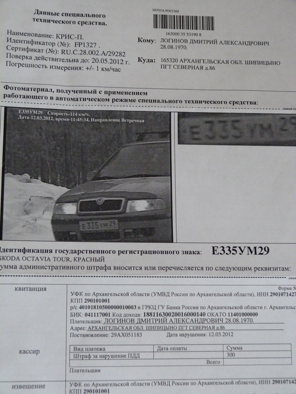 Эти «буквы» содержат следующую информацию: фотография, на которой виден автомобиль и его номерной знак, а также скорость автомобиля и данные о том, насколько эта машина превысила допустимую разрешенное ограничение скорости.Помимо этой информации, в «письме счастья» указывается статья Кодекса об административных правонарушениях, регулирующая наказание за совершенное правонарушение, размер штрафа (обычно 500 рублей) и срок, в течение которого водитель должен его уплатить.