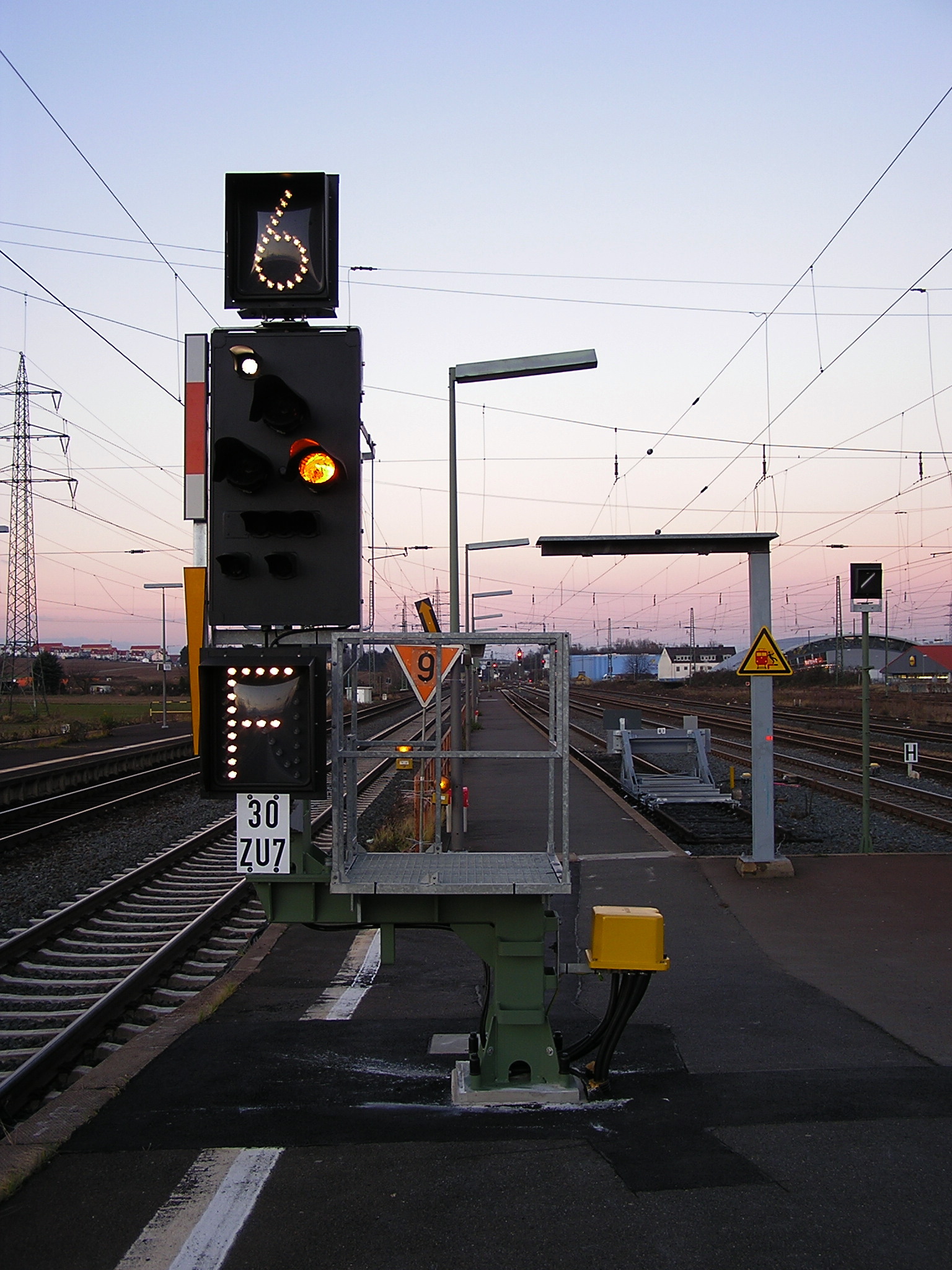 6. Светофоры устанавливаются с правой стороны по направлению движения или над осью ограждаемого ими железнодорожного пути. Заградительные светофоры и предупредительные к ним, устанавливаемые на перегонах перед железнодорожными переездами для поездов, следующих по неправильному железнодорожному пути, могут располагаться и с левой стороны по направлению движения поезда.