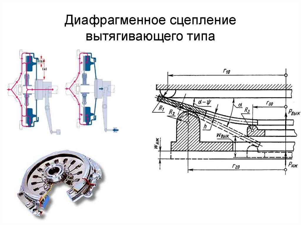 Диафрагменная пружина корзины может быть либо нажимного, либо вытяжного принципа действия. Отличие – в направлении приложения усилия от привода сцепления: к маховику или от маховика. Особенность конструкции пружины вытяжного действия позволяет использовать корзину, толщина которой значительно меньше. Это делает узел максимально компактным.