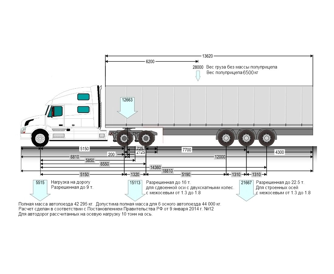 Если посчитать, что вес самого тягача составляет 7 тонн, и столько же весит полуприцеп, то максимальная нагрузка, которую он может брать на борт — 24 тонны. Если же количество осей другое, то имеем следующую картину: