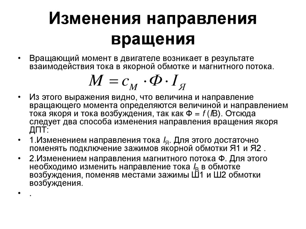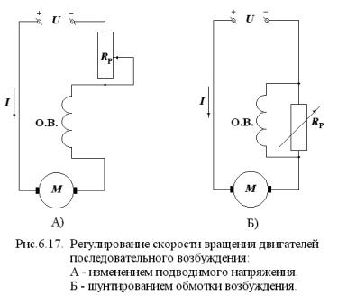 Регулирование частоты вращения ротора электродвигателя постоянного тока осуществляется изменением: тока возбуждения двигателя, напряжения, подводимого к двигателю, и сопротивления в цепи якоря. Наиболее широкое применение получили первые два способа регулирования; третий способ применяют редко, так как частота вращения ротора двигателя при этом значительно зависит от колебаний нагрузки.