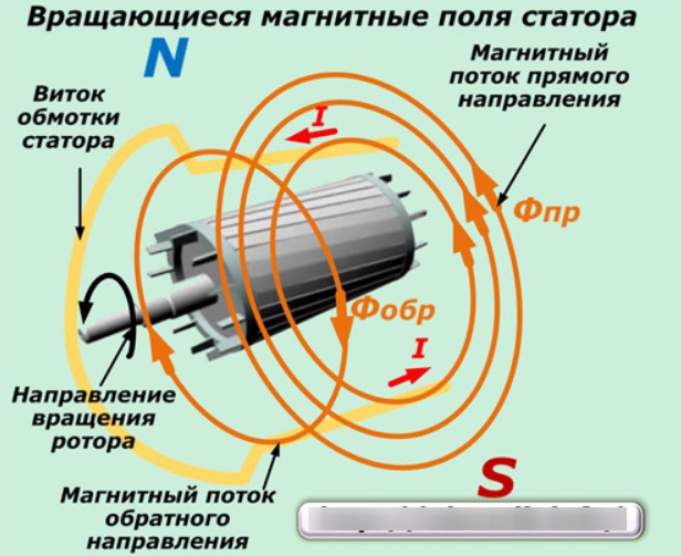 Вращение ротора электродвигателя происходит за счет того, что ток, поступая в обмотку статора, создает вращающееся магнитное поле, которое наводит электродвижущую силу в обмотке ротора, и по ней потечет электроток. При этом образуется магнитное поле ротора, которое будет взаимодействовать с магнитным вращающимся полем статора, в результате чего ротор начнет вращаться. [1]