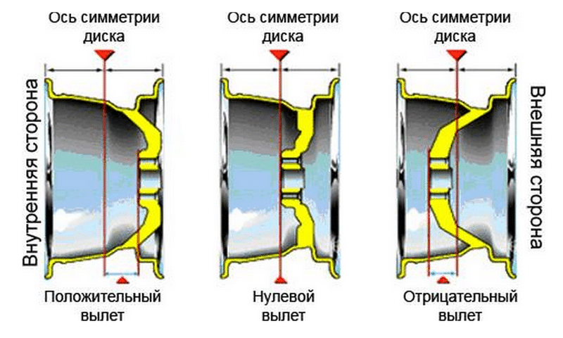 - Отрицательный дисковый вылет — характеризуется смещение привалочной плоскости вперед от средины ширины диска.