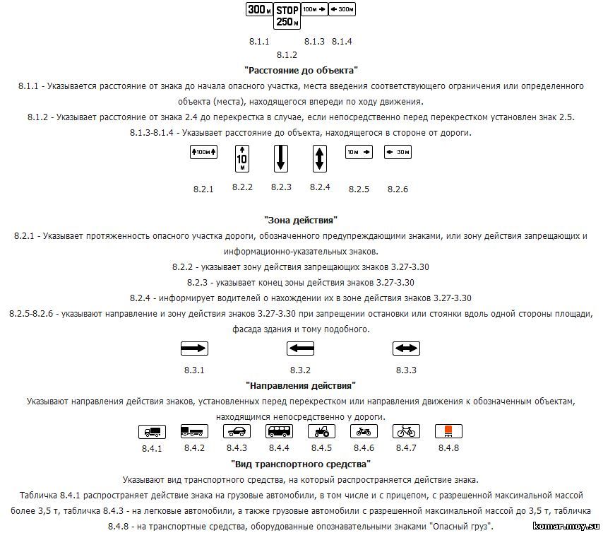 8.3.1 — 8.3.3 «Направления действия». Указывают направления действия знаков, установленных перед перекрестком, или направления движения к обозначенным объектам, находящимся непосредственно у дороги.