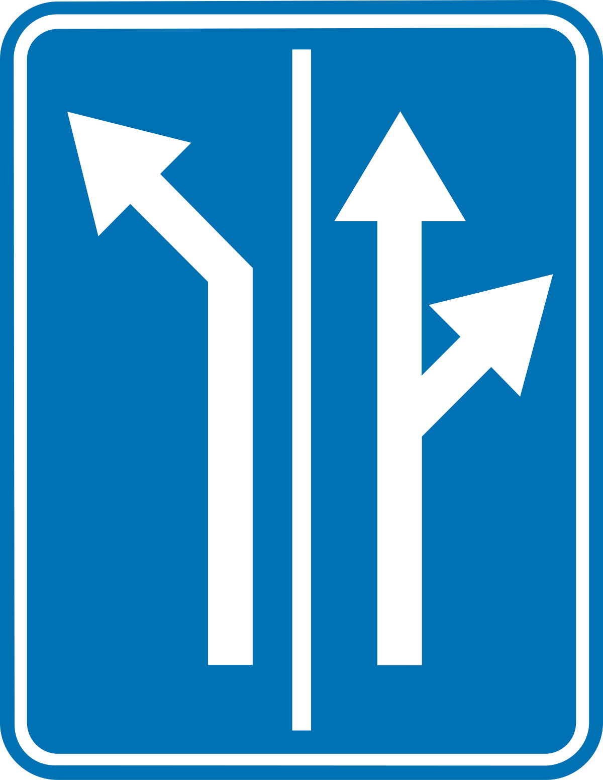 Знак «дорога сужается» предупреждает водителей о том, что впереди дорога не такая широкая, как та, по которой они едут. Водителям следует проявлять осторожность, чтобы оставаться в середине полосы движения.