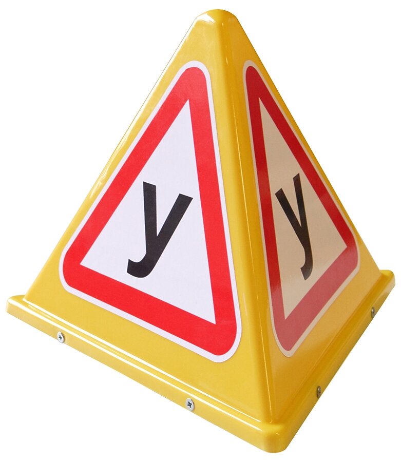 Знак выполнен в форме короба с символом «У», имеет светодиодную подсветку. Фиксируется на крыше авто посредством магнитов. На корпус плафона можно нанести рекламную информацию о школе вождения.