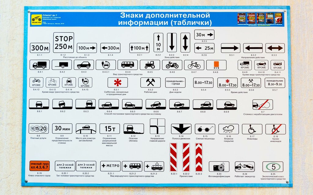 | 8.4.9 — 8.4.15 | Кроме вида транспортного средстваУказывают вид транспортного средства, на который не распространяется действие знака. Табличка 8.4.14 не распространяет действие знака на транспортные средства, используемые в качестве легкового такси. | |||||